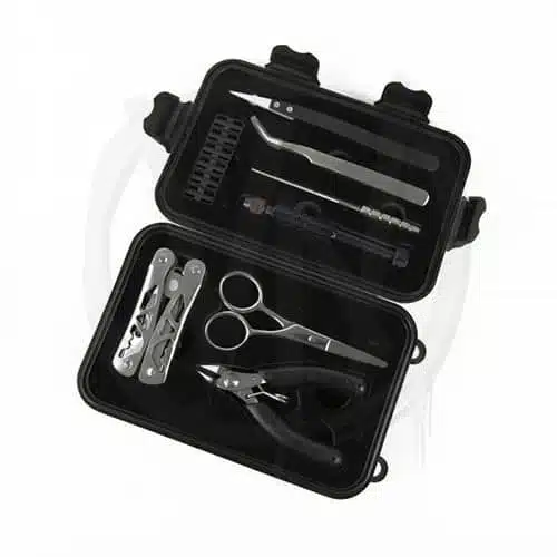 Verktygssamlingen innehåller en professionell skruvmejsel, en spetsig pincett, rostfritt stål sax, keramisk pincett, trådklippare, coiling jig stick, multifunktionella tänger och ett coilbenstrimningsverktyg. Alla delar förvaras i en väska med hårt skal som skyddar verktygen under transport och förvaring.
